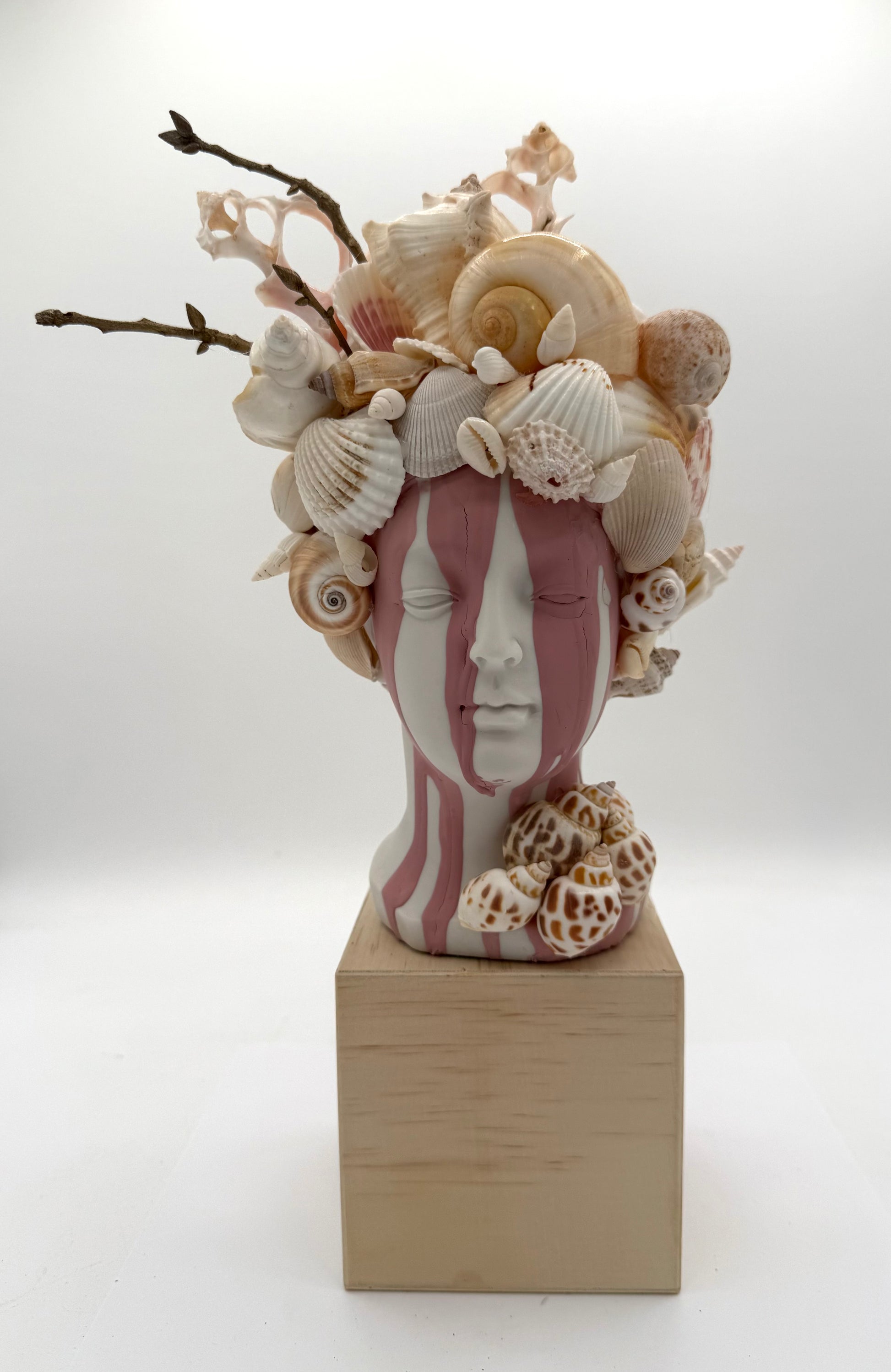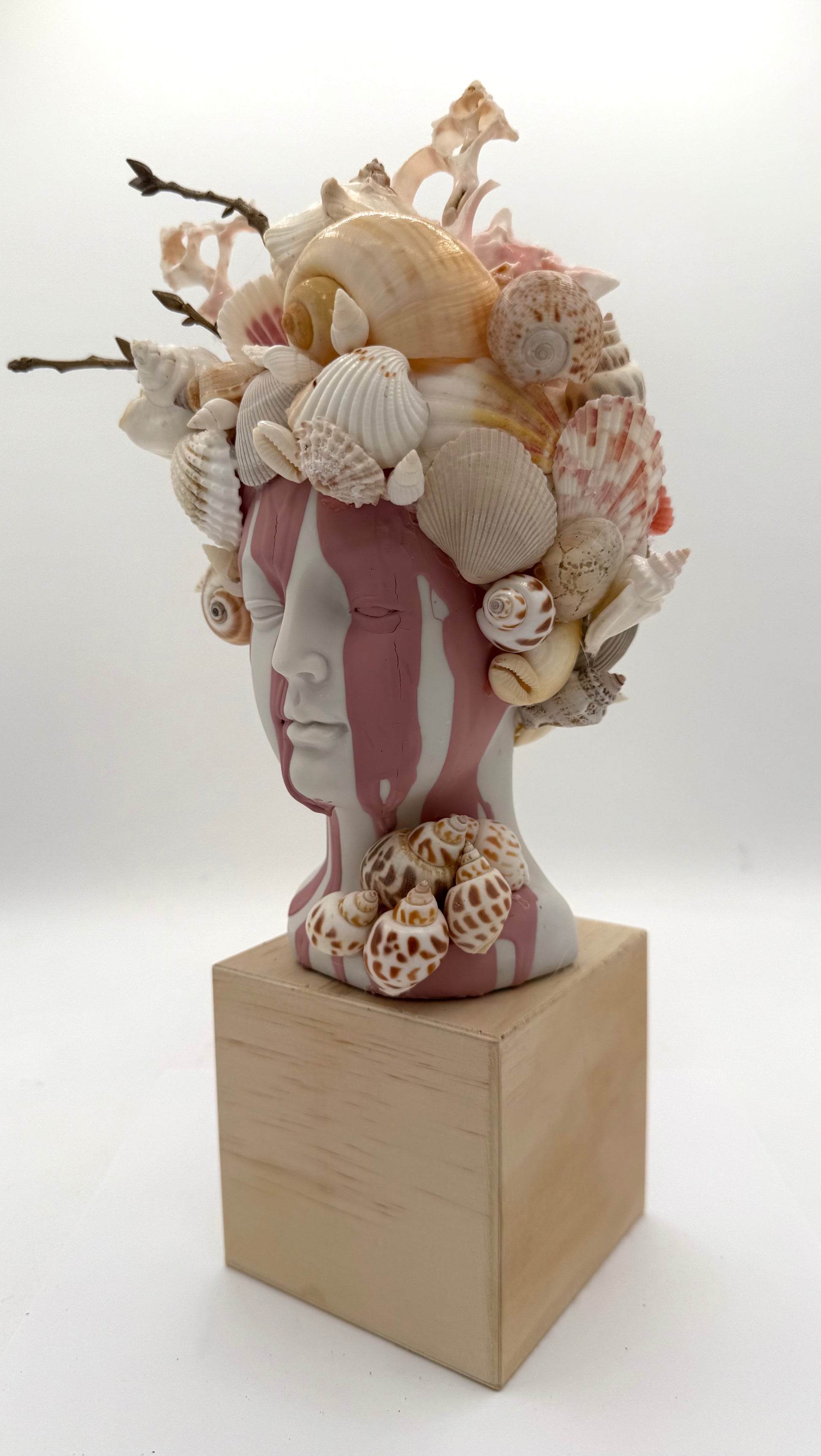 Shell Encrusted Mini white bust with paint dripped down her face on wooden stand. Handmade by Ruth Campbell. A variety of white, pale pink and green shells along with textured white coral make this mini unique.