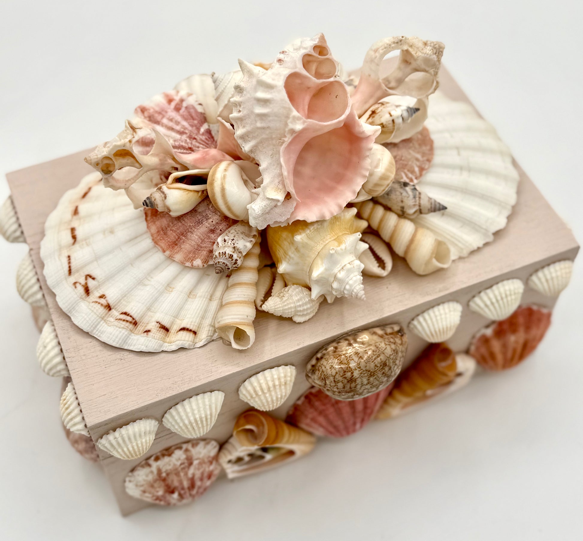 Our one-of-a-kind Shell Boxes are all handmade and designed by Ruth Campbell. Each box is painted and covered with a mix of unique shells varying in size and color. A velvet tab allows for easy opening. These are the perfect accessory for a coffee table or bookshelf.