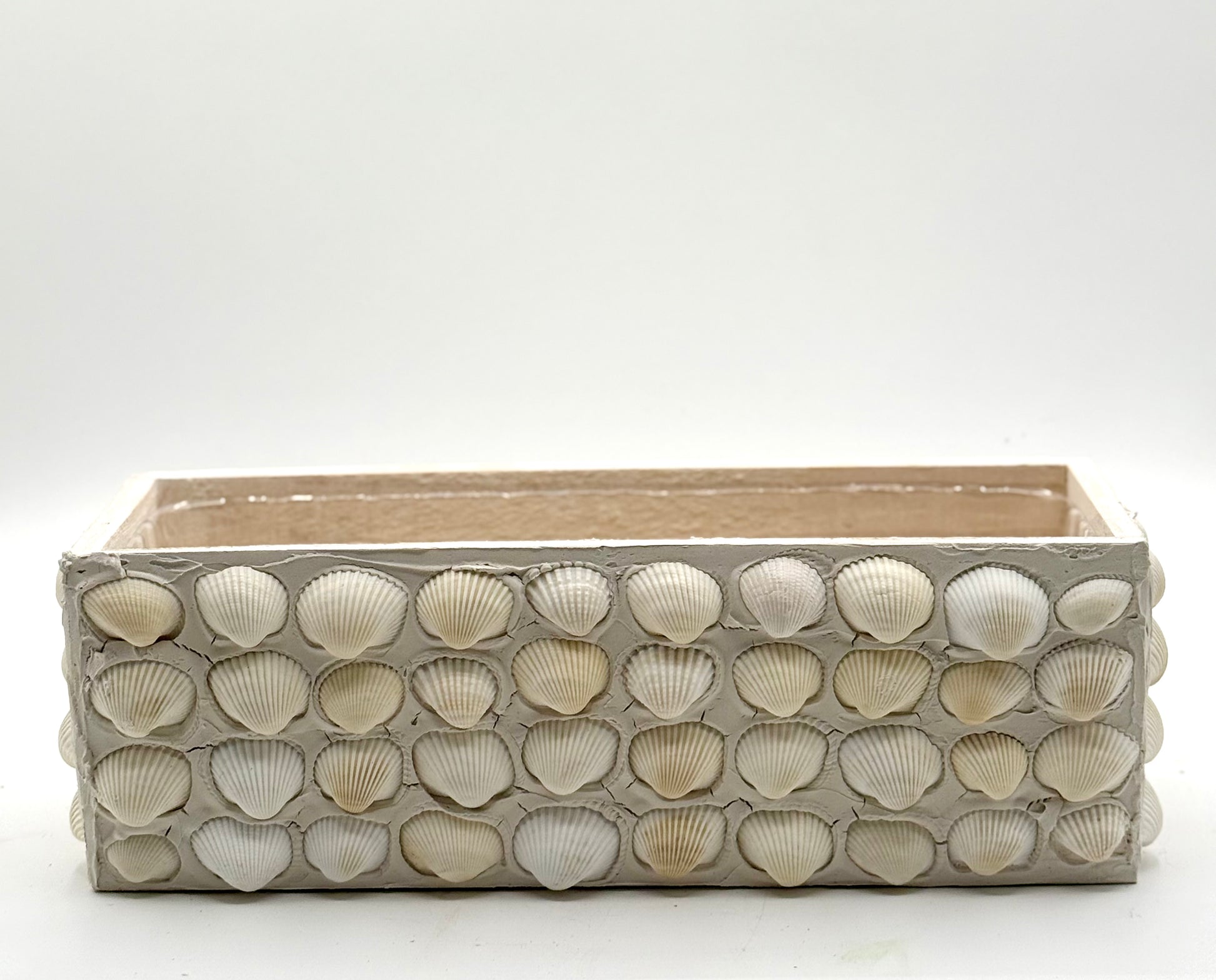 Each planter box is made of wood and covered in plaster with hand placed shells on all four sides. A plastic liner is included to allow for easy arrangement of flowers candles and more. These box planters make the perfect tabletop accessory for any home, porch, or party.